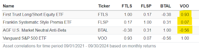 All three are long/short funds but they have different objectives and comparing them to each other beyond simply trying to understand what they are trying to do isn't productive. First Trust Long/Short (FTLS) is up a lot. It is trying to be more of an equity proxy. It's not up as much as the S&P 500 but is up a good amount and also managed to mostly trade sideways in 2022 which I wouldn't have expected. The Franklin Systematic Style Premia ETF (FLSP) is very clear up front what its trying to do, "aims to maintain a relatively low correlation to traditional asset classes and to deliver positive returns in rising or falling markets." Being mostly a horizontal line that tilts upward is the right expectation for this one. Comparing it to FTLS isn't the right way to look at it, the comparison would be to other market neutral or absolute return type strategies. We talk about BTAL all the time. It has a negative correlation that I believe it reliable so the result on the chart is right in line with that. It is capable of going up a lot when stocks go down a lot as opposed to FLSP which would hopefully be up a little, no matter what is going on. The correlation matrix captures exactly what I mean.